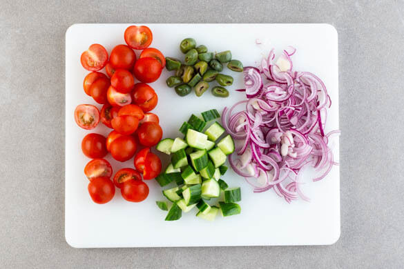 Die Zwiebel schälen, halbieren und in feine Streifen schneiden. Die Kirschtomaten und Oliven halbieren. Die Gurke längs vierteln und in ca. 1cm große Würfel schneiden.