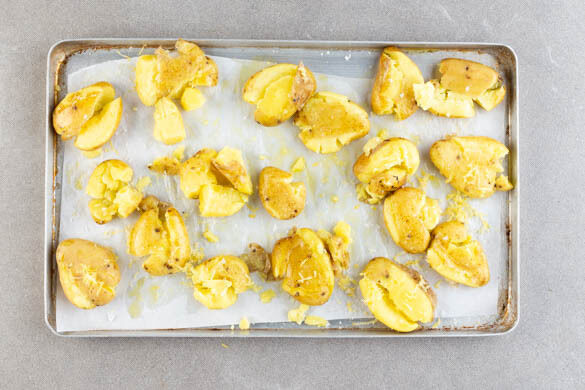 Die Kartoffeln in ein Sieb abgießen, abtropfen lassen und auf einem mit Backpapier ausgelegten Backblech verteilen. Mit 2TL Zitronenschale, 1EL Olivenöl und 1/2TL Salz vermengen. Die Kartoffeln mit der Topfunterseite platt drücken und 15–20Min. im Ofen goldbraun backen.