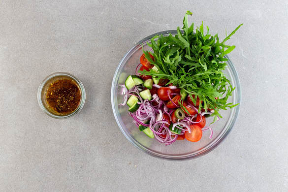 3EL Zitronensaft mit der 1/2 der Gewürzmischung, 2EL Olivenöl und je 1 kräftigen Prise Salz, Pfeffer und Zucker verrühren. Den Rucola mit den Gurken, den Tomaten, den Zwiebeln und den Oliven vermengen.