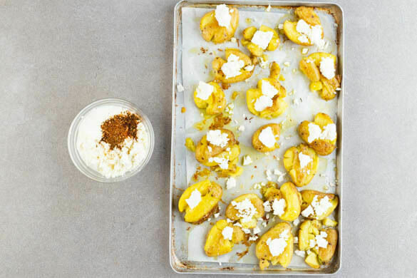 Kartoffeln mal anders? Aber gerne doch! Wie wäre es zum Beispiel mit knusprig gebackenen Quetschkartoffeln mit Feta-Topping? Dazu hätten wir einen zitronig-frischen Rucolasalat mit Tomaten, Gurken und Oliven im Angebot, der übrigens hervorragend mit dem Joghurt-Feta-Dressing mit frischer Minze zusammenpasst. Noch Fragen? Nein? Na dann: Guten Appetit!