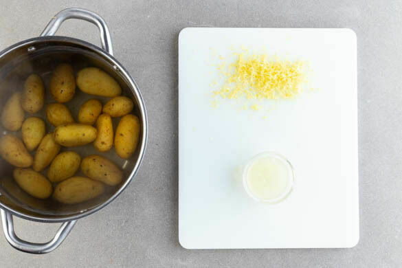Den Backofen mit Grillfunktion oder Ober-/Unterhitze auf 220°C vorheizen. In einem mittelgroßen Topf ausreichend gesalzenes Wasser für die Kartoffeln zum Kochen bringen. Die Zitronenschale abreiben, dann die Zitrone halbieren und auspressen. Die Kartoffeln in das kochende Wasser geben und ca. 10Min. vorkochen.
