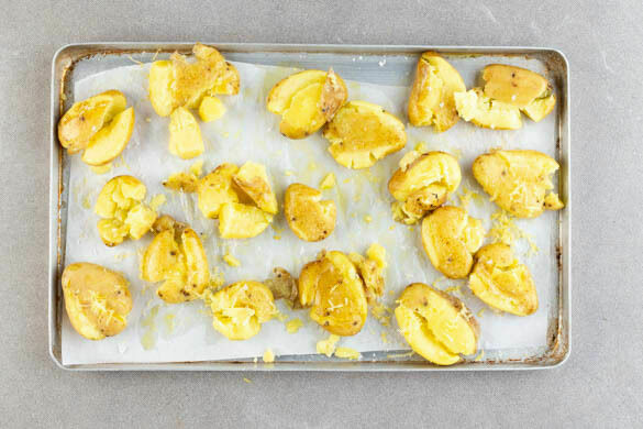 Die Kartoffeln in ein Sieb abgießen, abtropfen lassen und auf einem mit Backpapier ausgelegten Backblech verteilen. Mit 3TL Zitronenschale, 2EL Olivenöl und 1/2TL Salz vermengen. Die Kartoffeln mit der Topfunterseite platt drücken und 15–20Min. im Ofen goldbraun backen.