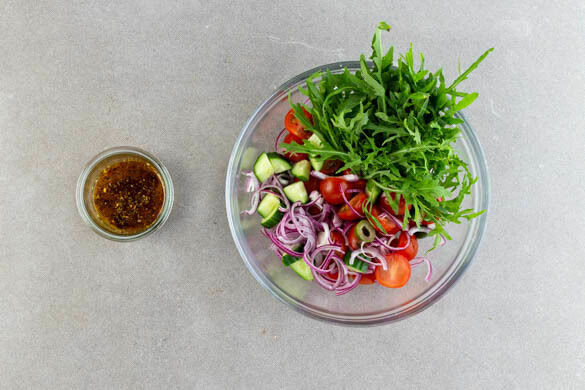Den Zitronensaft mit der 1/2 der Gewürzmischung, 3EL Olivenöl und je 1 kräftigen Prise Salz, Pfeffer und Zucker verrühren. Den Rucola mit den Gurken, den Tomaten, den Zwiebeln und den Oliven vermengen.