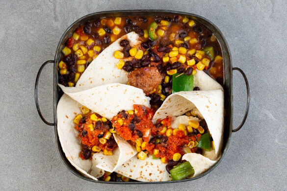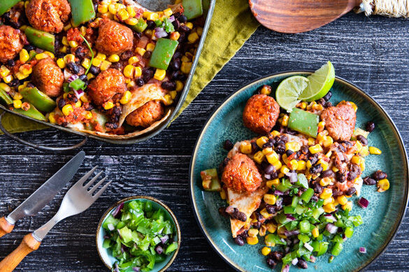 Fast wie eine Lasagne kommt er daher, dieser mexikanisch inspirierte Auflauf – aber statt Pasta kommt er wunderbar mit Tortillas aus und statt Fleisch gibt es hier vegane Hackbällchen. Dazwischen tummeln sich frische Paprika und Tomate, süßer Mais, nährende schwarze Bohnen und Gewürze. Als aromatisches i-Tüpfelchen servierst du eine leckere Salsa mit Paprika, Koriander, Limette und roter Zwiebel. Ein Traum!