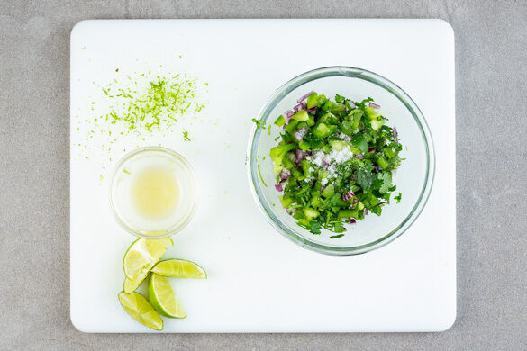 Die Limette abreiben und halbieren, eine Hälfte auspressen, die übrige Hälfte in Spalten schneiden. Den Koriander samt Stängeln fein schneiden. Die übrigen Paprikawürfel mit den restlichen Zwiebeln, dem Koriander, 1/2TL Limettenschale, 1EL Limettensaft und je 1 Prise Salz und Zucker vermengen.