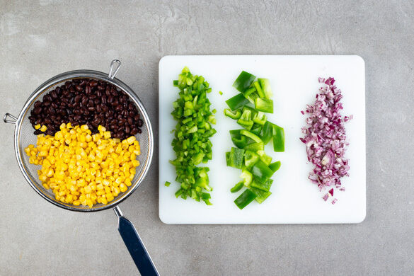 Den Backofen auf 220°C (200°C Umluft) vorheizen. Die Bohnen und den Mais in einem Sieb mit kaltem Wasser abspülen und abtropfen lassen. Die Paprika halbieren und entkernen. Eine Hälfte in ca. 2cm große Würfel, die andere Hälfte in ca. 0,5cm kleine Würfel schneiden. Die Zwiebel schälen, halbieren und fein würfeln.