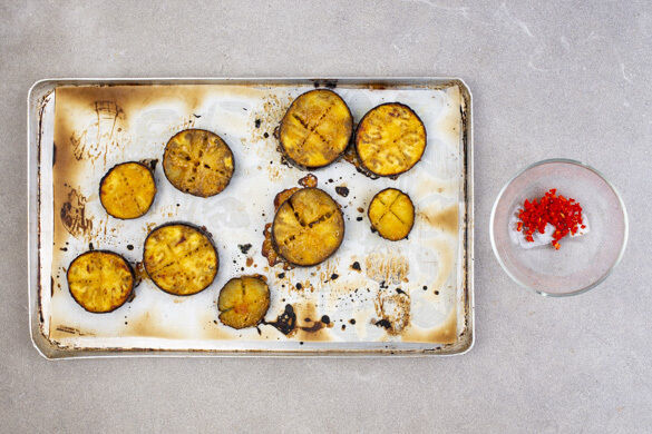 Die Auberginen nach 20Min. aus dem Ofen nehmen, die Grillfunktion einschalten oder Temperatur um 45°C erhöhen. Die Auberginen mit der Würzsauce bestreichen und 4–5Min. grillen. Übrige Würzsauce aufbewahren. Die Peperoni längs halbieren, eine Hälfte in dünne Streifen schneiden, die andere Hälfte wird nicht benötigt. Tipp: Für weniger Schärfe die Kerne entfernen.