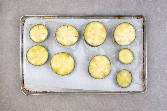 Den Backofen auf 200°C (180°C Umluft) vorheizen. In einem mittelgroßen Topf ausreichend gesalzenes Wasser für 2/3 der Nudeln zum Kochen bringen. Die Aubergine in Scheiben schneiden, auf einem mit Backpapier ausgelegten Backblech verteilen, mit etwas Pflanzenöl beträufeln und 1 Prise Salz darüberstreuen. Die Auberginen ca. 20Min. im Ofen backen.