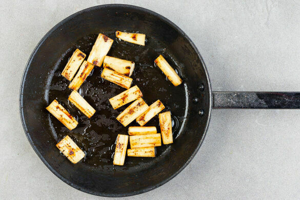 Die Schwarzwurzeln aus dem Essigwasser nehmen und abtropfen lassen, ggf. mit etwas Küchenkrepp trocken tupfen. In der Pfanne bei mittlerer bis starker Hitze 6–8Min. goldbraun und weich braten, die Pfanne vom Herd nehmen und beiseitestellen.