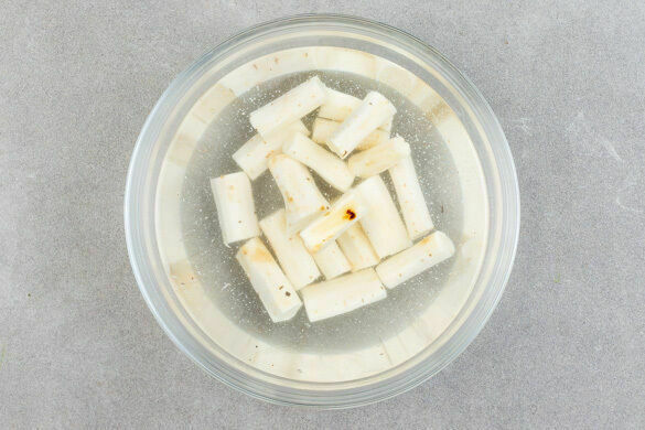 Die Schwarzwurzeln schälen und in 4–5cm lange Stücke schneiden, dabei am besten Küchenhandschuhe und Schürze tragen, da der austretende milchige Saft klebrig ist und sich bei Luftkontakt braun färbt. In einer Mischung aus 2L kaltem Wasser und 4EL Essig einlegen.