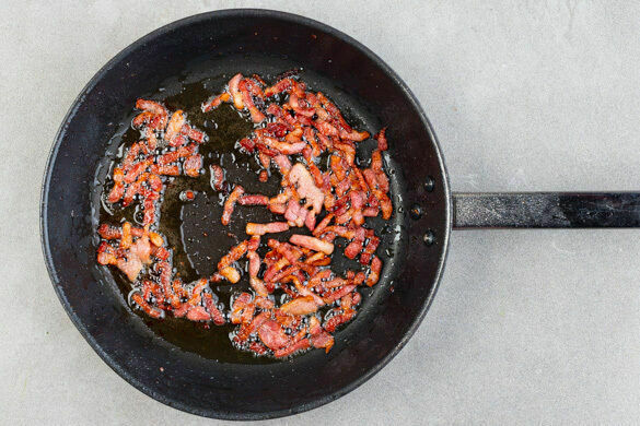 Den Speck in einer mittelgroßen Pfanne bei starker Hitze 5–7Min. knusprig anbraten. Aus der Pfanne nehmen und auf Küchenkrepp abtropfen lassen, die Pfanne mit ca. 2EL Fett aufbewahren.