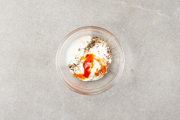 1EL Joghurt mit 1EL Mayonnaise und Sriracha-Sauce nach Belieben verrühren, mit Salz und Pfeffer abschmecken.