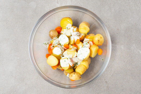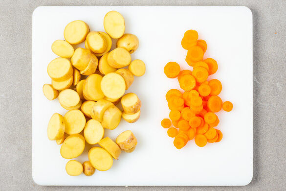Den Backofen auf 200°C (180°C Umluft) vorheizen. In einem mittelgroßen Topf ausreichend gesalzenes Wasser für die Kartoffeln und die Karotte zum Kochen bringen. Die Kartoffeln in ca. 1cm dicke Scheiben schneiden. Die Karotte ggf. schälen und in sehr dünne Scheiben schneiden. Sobald das Wasser kocht, das Gemüse hineingeben und 10–12Min. kochen.