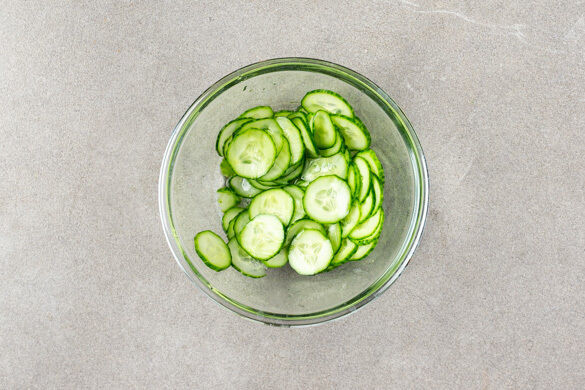 Die Gurke in hauchdünne Scheiben schneiden, mit 2EL Essig, 1TL Zucker und 1/2TL Salz vermengen und ziehen lassen, zwischendurch einmal umrühren.