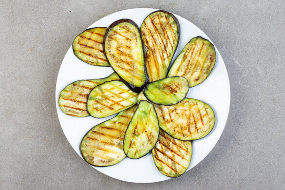 Eine Grillpfanne mit etwas Olivenöl bepinseln und bei mittlerer Hitze erwärmen. Portionsweise die Auberginenscheiben hineingeben und ca. 4Min. grillen. Währenddessen die Oberseiten der Auberginen mit etwas Olivenöl bepinseln und mit Salz würzen. Die Auberginen wenden, wieder mit etwas Salz würzen und ca. 4Min. grillen. So fortfahren, bis alle Auberginenscheiben gegrillt sind.