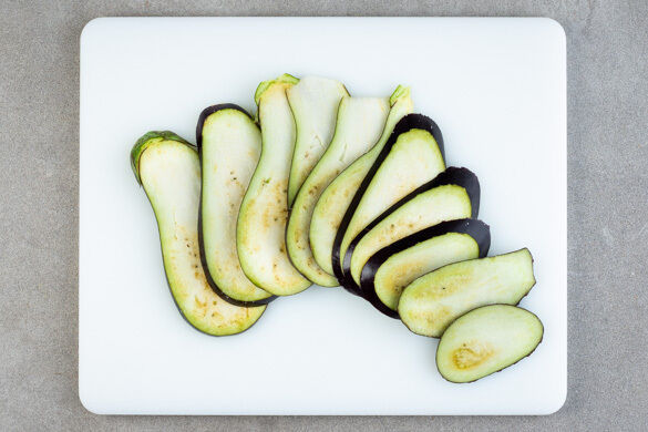 Den Backofen auf 220°C (200°C Umluft) vorheizen. In einem mittelgroßen Topf ausreichend gesalzenes Wasser für die Lasagneblätter zum Kochen bringen. Die Aubergine in dünne Scheiben schneiden.