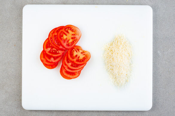 Die Tomaten in Scheiben schneiden. Den Käse reiben.