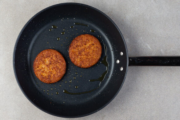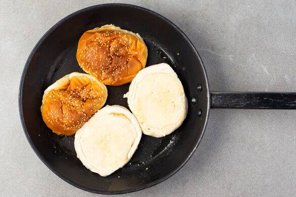 Die Burgerpattys in einer mittelgroßen Pfanne mit 1EL Pflanzenöl bei mittlerer Hitze auf jeder Seite 2–3Min. goldbraun braten. Die Pattys auf einem Teller beiseitestellen. Die Pfanne auswischen und aufbewahren.