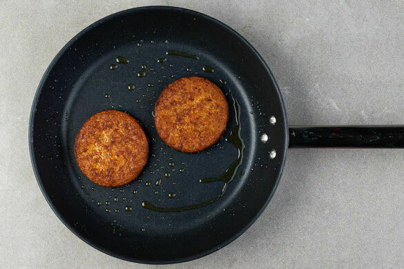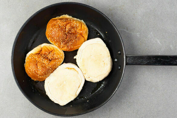 Die Burgerpattys in einer großen Pfanne mit 2EL Pflanzenöl bei mittlerer Hitze auf jeder Seite 2–3Min. goldbraun braten. Die Pattys auf einem Teller beiseitestellen. Die Pfanne auswischen und aufbewahren.