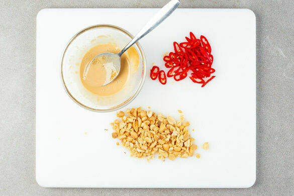 Die Erdnüsse grob hacken. Die Peperoni in feine Ringe schneiden. Tipp: Für weniger Schärfe die Kerne entfernen. Die Sojasauce mit 2EL Mayonnaise, 2EL Essig, 2EL Wasser und 1TL Zucker verrühren.