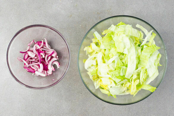 Die Zwiebel schälen, halbieren und in feine Streifen schneiden. Den Salat ebenfalls in feine Streifen schneiden. Die Zwiebeln mit 1EL Essig, 1/2TL Zucker und 1 kräftigen Prise Salz vermengen und beiseitestellen.