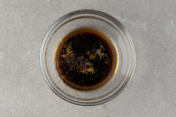 1EL Essig (bevorzugt Balsamico- oder Rotweinessig) mit 1/2TL Salz sowie je 1 Prise Pfeffer und Zucker verrühren, bis sich das Salz aufgelöst hat, dann 2EL Olivenöl untermischen.