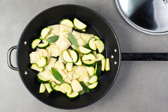Eine große Pfanne stark erhitzen. Die Zucchini, den Knoblauch, den Salbei und die Ravioli hineingeben, 300ml Brühe angießen und abgedeckt 4–5Min. köcheln lassen.