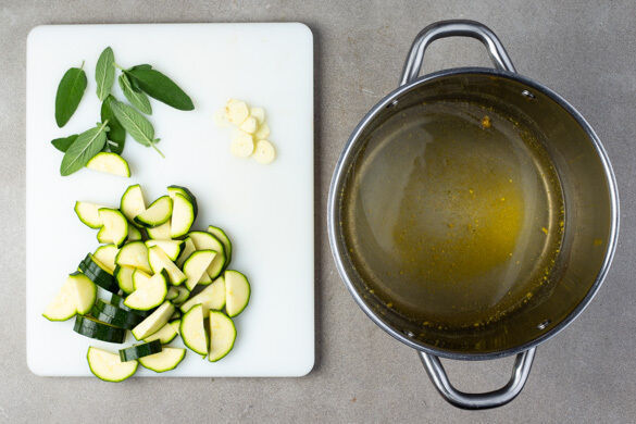 In einem kleinen Topf 500ml Wasser zum Kochen bringen und die 1/2 des Brühgewürzes einrühren. Die Zucchini längs halbieren und in ca. 1cm dicke Scheiben schneiden. Den Knoblauch schälen und in dünne Scheibchen schneiden. Die Salbeiblätter von den Stängeln zupfen.