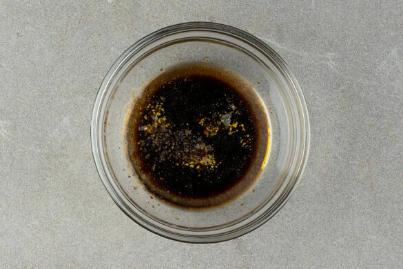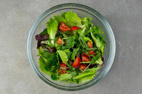 2EL Essig (bevorzugt Balsamico- oder Rotweinessig) mit 1/2TL Salz sowie je 2 Prisen Pfeffer und Zucker verrühren, bis sich das Salz aufgelöst hat, dann 4EL Olivenöl untermischen. Das Dressing ggf. mit Salz abschmecken.