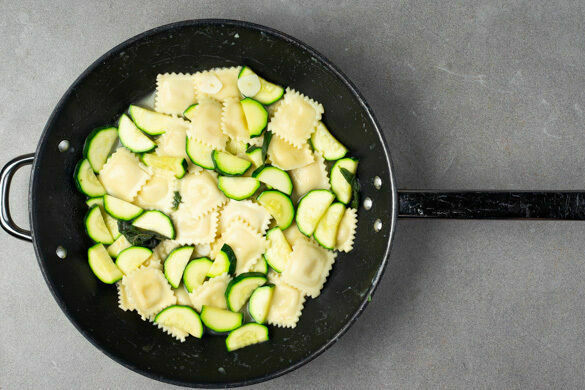 Zwei große Pfannen stark erhitzen. Die Zucchini, den Knoblauch, den Salbei und die Ravioli auf die Pfannen verteilen, je 300ml Brühe angießen und abgedeckt 4–5Min. köcheln lassen.