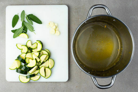 In einem mittelgroßen Topf 1L Wasser zum Kochen bringen und das Brühgewürz einrühren. Die Zucchini längs halbieren und in ca. 1cm dicke Scheiben schneiden. Den Knoblauch schälen und in dünne Scheibchen schneiden. Die Salbeiblätter von den Stängeln zupfen.