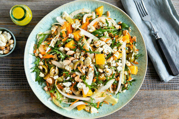 Der erfrischend fruchtige sizilianische Insalata di arance – oder auch Orangensalat –, der dank frischem Fenchel, aromatischen Kräutern und Oliven immer wieder eine Aromabombe der besonders leckeren Art darstellt, ist ursprünglich eher eine Vorspeise oder Beilage. Bei uns bekommt er heute mit Chicorée, Karotte und Rucola eine Extraportion Saft und Kraft, und das Fetatopping ist die sättigende Krönung der Herrlichkeiten!