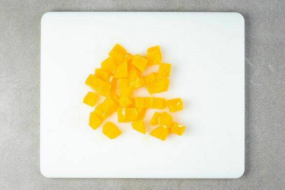 Die Orangen komplett abschälen, halbieren und das weiße Innere entfernen, dann die Orangen in 1–2cm große Würfel schneiden, den austretenden Saft auffangen.