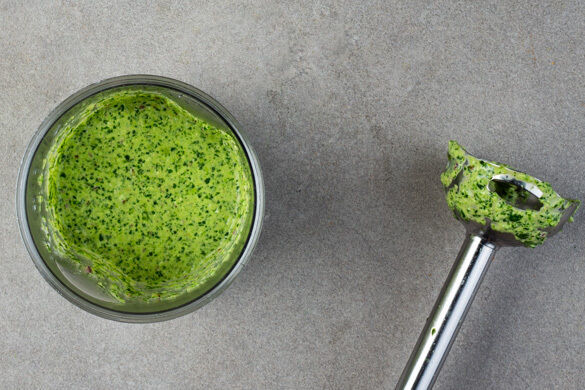 Den Knoblauch schälen und mit der Petersilie und dem Koriander samt Stängeln, den Zwiebeln, der Chilischote, 2EL Limettensaft, der Mayonnaise, 2EL Wasser sowie je 1 Prise Salz und Pfeffer in einem hohen Gefäß mit einem Stabmixer zu einer glatten Salsa pürieren. Tipp: Wer es nicht so scharf mag, püriert nur einen Teil der Chilischote.