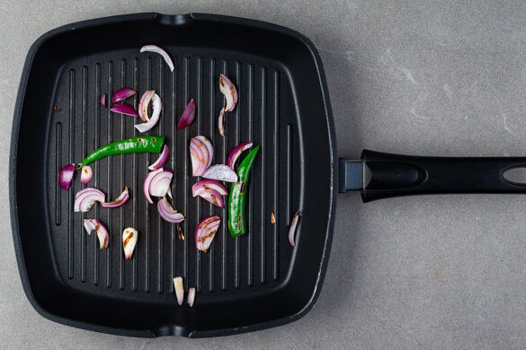 Die Chilischote längs halbieren und die Kerne entfernen. Die restlichen Zwiebeln und die Chilischote in einer Grillpfanne ohne Zugabe von Fett bei starker Hitze 3–4Min. grillen, dabei gelegentlich wenden.