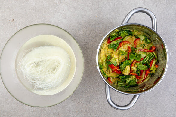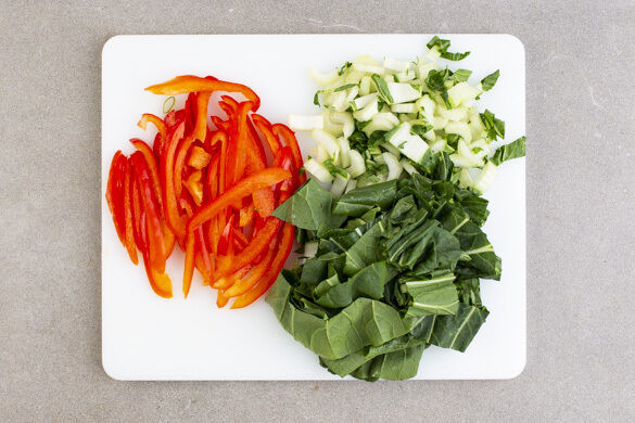 Die Paprika vierteln, entkernen und in dünne Streifen schneiden. Den weißen Teil des Pak Choi in schmale, den grünen Teil in breite Streifen schneiden. In einem Wasserkocher 1L Wasser zum Kochen bringen.