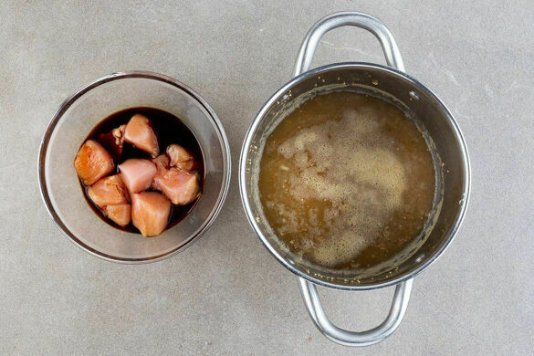 In einem mittleren Topf 850ml leicht gesalzenes Wasser zum Kochen bringen. Das Fleisch trocken tupfen und mit der Sojasauce vermengen. Den Knoblauch schälen und fein würfeln. Die Quinoa in einem Sieb abspülen, mit dem Knoblauch und der 1/2 des Brühgewürzes in den Topf geben und 10–12Min. abgedeckt bei niedriger bis mittlerer Hitze köcheln.