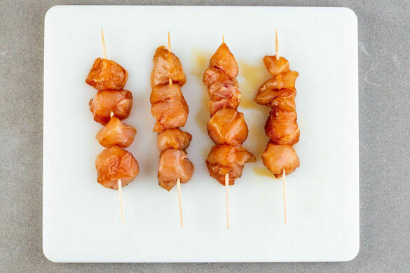Das Fleisch auf die Holzspieße ziehen, die übrige Sojasauce aufbewahren. Tipp: Wenn die süß-saure Sauce des Gemüses noch zu flüssig ist, 2TL Mehl mit 2EL kaltem Wasser vermengen und langsam in die Sauce einrühren. Noch ein paar Minuten köcheln lassen, bis die Sauce die gewünschte Sämigkeit erreicht.
