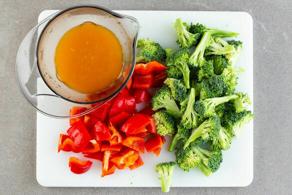 Den Brokkoli in mundgerechte Röschen schneiden. Die Paprika vierteln, entkernen und in ca. 2cm große Würfel schneiden. Die Orangen halbieren und auspressen.
