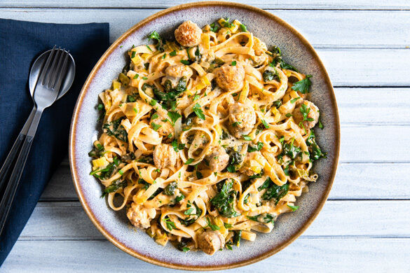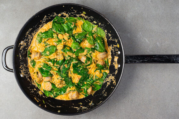 Sollte draußen das sprichwörtliche Aprilwetter toben, dann geht doch nichts über einen Teller wohlig dampfender Pasta – und mit unserer heutigen Kreation machst du mit Sicherheit alles richtig! Die feinen Tagliatelle räkeln sich in einer cremigen Sauce mit Spinat, Lauch und frischen Tomaten, deftig wird’s mit gebratener Rindswurst. Und da es im Frühling auch gerne mal etwas mehr Grün sein darf, gibt es noch Petersilie, hurra!