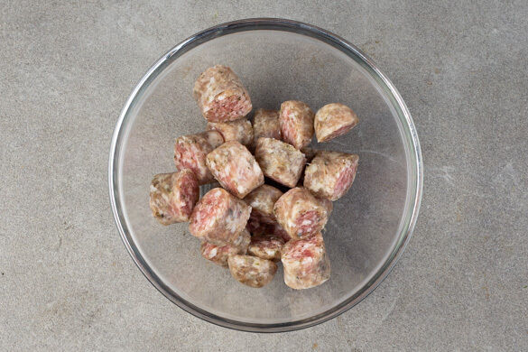 In einem mittelgroßen Topf ausreichend gesalzenes Wasser für die Pasta zum Kochen bringen. Die Würste in ca. 2cm dicke Scheiben schneiden.