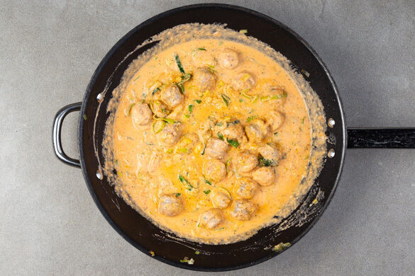 In der Zwischenzeit die Tomaten vierteln und mit der Crème fraîche, der 1/2 der Gewürzmischung und 1 Prise Salz in einem hohen Gefäß mit einem Stabmixer zu einer cremigen Sauce pürieren. Die Sauce mit in die Pfanne geben und alles abgedeckt bei mittlerer Hitze 4–5Min. köcheln lassen.