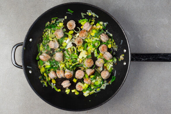 Den Lauch der Länge nach vierteln und in dünne Streifen schneiden. Die Wurstscheiben und den Lauch in einer großen Pfanne mit 1EL Olivenöl bei starker Hitze 2–3Min. anbraten, bis der Lauch weich ist und die Wurstscheiben goldbraun sind, dabei gelegentlich umrühren.