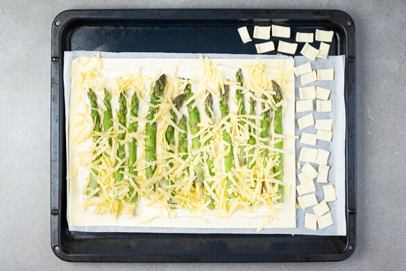 Den Teig gleichmäßig mit der Trüffelcreme bestreichen, an den Rändern ca. 1cm frei lassen. Die Spargelstangen auf die Trüffelcreme legen und den Käse darüberstreuen. Den Flammkuchen 18–20Min. im Ofen goldbraun backen. Die Teigquadrate in den letzten 12–15Min. neben dem Flammkuchen auf das Backblech geben und ebenfalls goldbraun und knusprig backen.