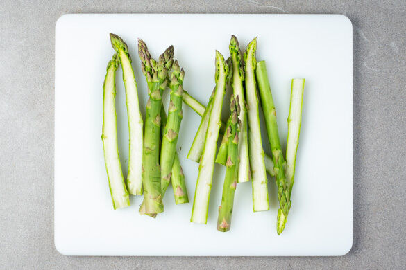 Die holzigen Enden des Spargels abschneiden, die Stangen längs halbieren.