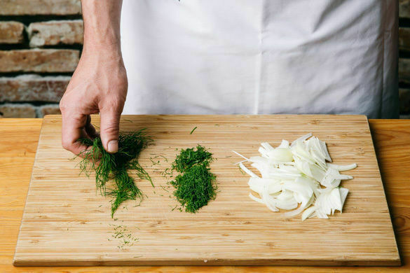 Die Zwiebel schälen, halbieren und in dünne Streifen schneiden. Die Dill samt Stängeln fein schneiden. Einige Dillspitzen für die Garnitur beiseitelegen.