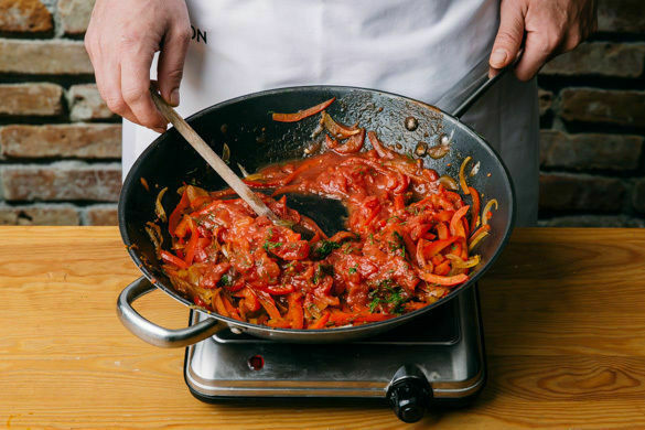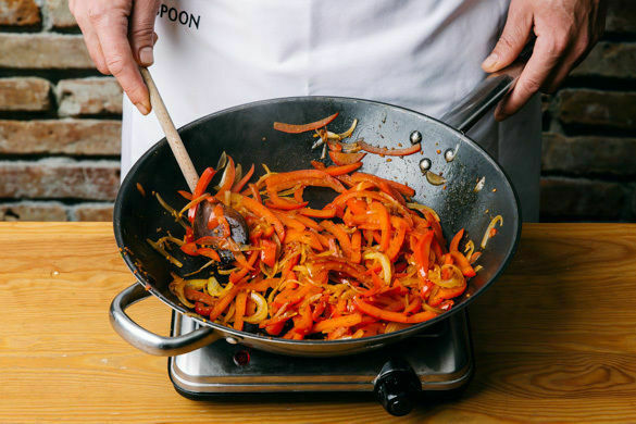 Die Paprika und die Zwiebeln in einer großen Pfanne oder einem Wok mit 2EL Olivenöl bei mittlerer Hitze 5–6Min. unter Rühren anbraten, bis das Gemüse weich ist. Ggf. etwas Wasser zugeben. Das Gulaschgewürz hinzufügen und mit Salz und Pfeffer abschmecken.