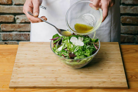 Die Lauchzwiebel in feine Ringe schneiden. 2EL Olivenöl mit 1EL Essig sowie je 1 kräftigen Prise Salz und Pfeffer verrühren und mit dem Salat und den Lauchzwiebeln vermengen. Die Gnocchi mit dem Paprika-Zwiebel-Gemüse, dem Salat und einem Klecks Crème fraîche anrichten, mit dem restlichen Dill garnieren und servieren.