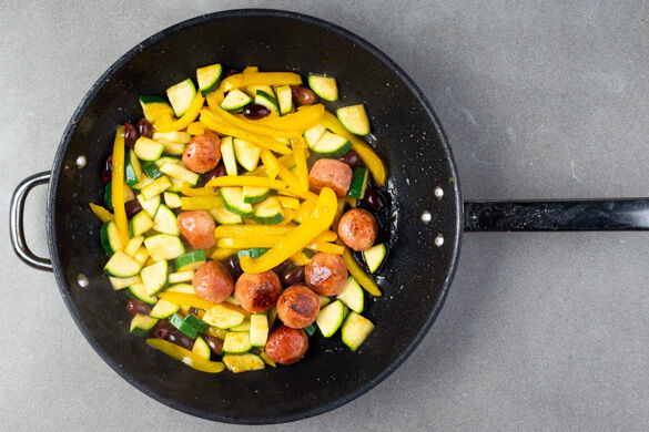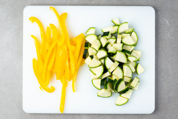 Die Paprika vierteln, entkernen und in dünne Streifen schneiden. Die Zucchini längs vierteln und in dünne Scheiben schneiden.