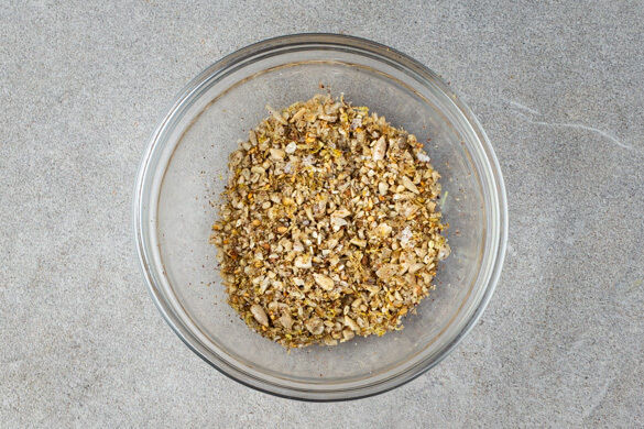 Den restlichen Knoblauch in der Pfanne mit 1EL Olivenöl ca. 1Min. anbraten und auf einem Teller beiseitestellen, das Öl in der Pfanne lassen. Die Sonnenblumenkerne grob hacken, mit der Za’atar-Gewürzmischung, 1TL Zitronenschale, dem Knoblauch und 1 Prise Salz vermengen und über die Guacamole streuen.